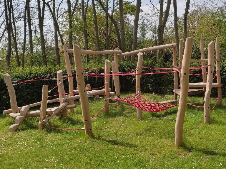 Die Kletteranlage ist eine kompakte Bewegungslandschaft aus 15 Stützen, 7 liegenden Stützen, einer Stammtreppe, einer Wackelbohle, einer Hangelstrecke, 4 Ketten-Tritten, einer “Slackline”, einem engmaschigen Lümmelnetz, einem Balanciertau und diversen Fuß- und Handseilen. Auf kleiner Fläche und ohne die Notwendigkeit eines separaten Fallschutzes (Fallhöhe unter 1m – Oberboden ist ausreichend) bietet es viel Potential für motorische Entwicklung.